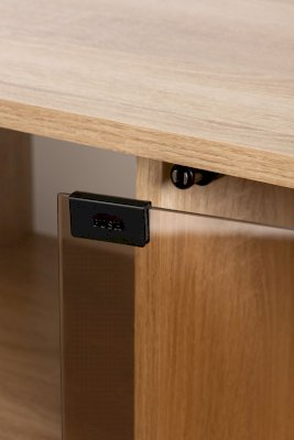 Створки крепятся на петли с доводчиками для плавности хода. Конструкцией предусмотрен механизм открывания створок «push-to-open». Ручки ящиков из натурального массива дуба.