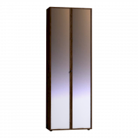 Двухдверный распашной шкаф легко открывается за ручку-петлю из микрофибры, которая устанавливается на одном зеркальном фасаде, другой - открывается за рамку. Шкаф комплектуется выдвижной штангой и двумя нишами сверху и снизу. Корпус шкафа выполнен в декоре Дуб Табачный. Регулируемые опоры компенсируют неровности пола.