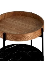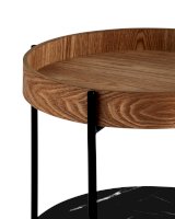 Круглый журнальный столик в современном минималистичном дизайне впишется в любой интерьер. Столешница выполнена из МДФ и покрыта шпоном из ясеня. Высокие бортики по краям предотвращают падение предметов со столика. Нижняя полка из МДФ с рисунком под мрамор идеально подойдет для хранения книг или журналов. Черный металлический каркас выдерживает нагрузку до 50 кг. Пластиковые подпятники в основании ножек защищают напольные покрытия от царапин и предотвращают скольжение.