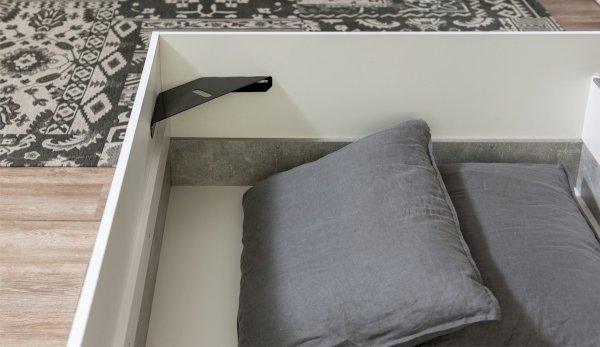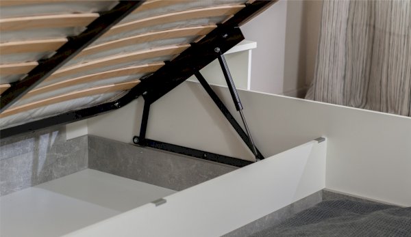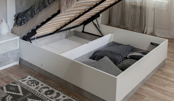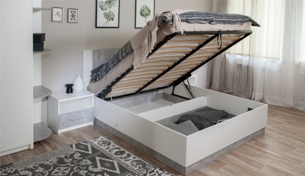 Кровать Аврора - акцент спальни, выполнена в стиле минимализм, удобна и просторна, можно с комфортом проводить свободное время. Изголовье - комбинированное, с декоративной вставкой контрастного цвета по центру. Кровать с надежным ортопедическим основанием с подъемным механизмом на газлифтах, внутри расположены две секции для хранения подушек, одеяла и любых других вещей.
