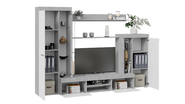 Сочетание белых фасадов, черной лицевой фурнитуры и каркасов в текстуре «Цемент светлый» способно освежить и преобразить комнату, придать интерьеру вашей гостиной современный, благородный вид.