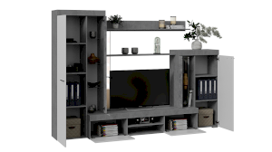 Гостиная «Амстердам» является единой композицией, где пространство шкафа разделено вертикально на две части. За стеклянной дверью и глухим фасадом предусмотрены вместительные отделения с полками для хранения любых вещей и аксессуаров. Наполнение тумбы под ТВ, где прекрасно разместились открытые и закрытые ниши, создает идеальную систему для хранения различных предметов, которые используются в повседневной жизни.