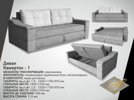 • Габариты: 2500x1100x950 мм - Размер спального места: 2000х1550 мм