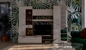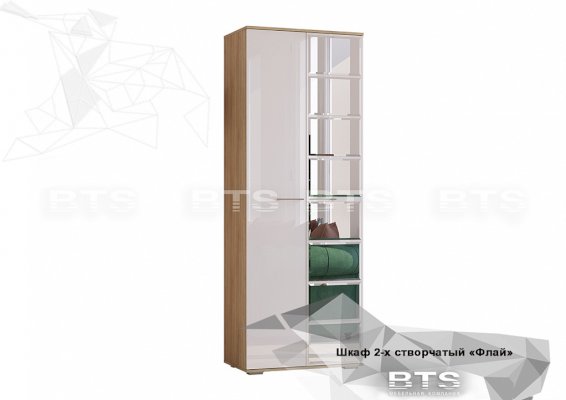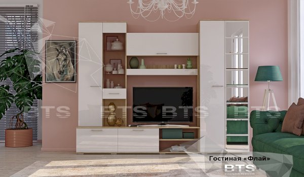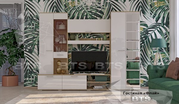 Модульная система «Флай» для гостиной – это современное решение для квартиры и дома. Благодаря лаконичному дизайну и приятному актуальному цветовому решению гостиная отлично впишется в любой интерьер. Сочетание оттенков натурального дерева с глянцевыми белыми фасадами – это тренд настоящего времени, который, несомненно, привлечет взгляды и вызовет интерес Ваших гостей. Зеркальные плитки с фацетом на створке шкафа наполнят пространство легкой игрой света, подарив тем самым отличное настроение.
