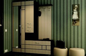 Состоит из полки с крючками, тумбы и шкафа с выдвижной штангой.